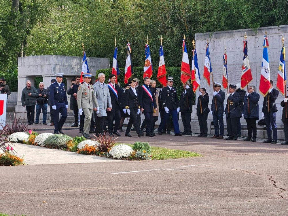 A 11h, une cérémonie militaire s'est déroulée au monument aux Morts du parc Jouvet de Valence, sous la Présidence de Madame Marie-Aimée GASPARI, Préfète de la Drôme, en présence de Monsieur Paul CHRISTOPHLE, député de la 1ère circonscription de la Drôme, Monsieur Nicolas DARAGON, maire de Valence, Madame Véronique PUGEAT, Vice-présidente du Conseil départemental, Monsieur Laurent MONNET, conseiller départemental, du colonel Maxime LAUDET, chef de corps des Spahis, de l’adjoint au commandant le Groupement de gendarmerie départementale de la Drôme, de Madame Laure BONNET, directrice de l’ONaCVG de la Drôme, de nombreuses personnalités civiles et militaires, des représentants des Ordres nationaux et des associations patriotiques et d’anciens combattants avec leurs drapeaux.