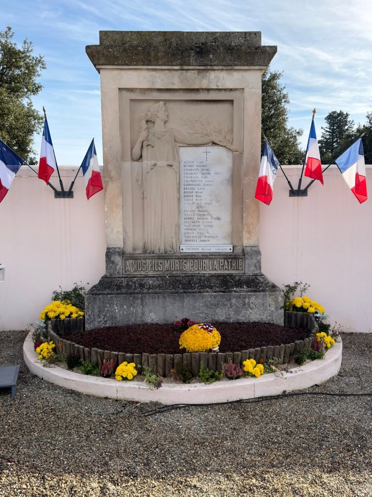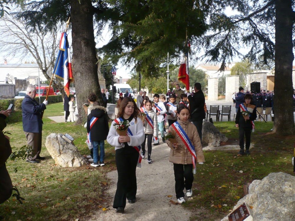cérémonie au monument aux morts avec fleurissement par les membres du conseil municipal enfants du chemin de la mémoire.