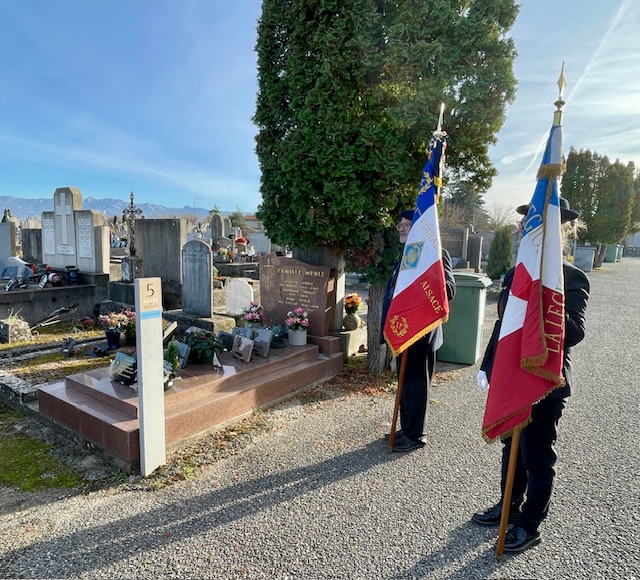 Le samedi 29 novembre, dans les allées du cimetière de Romans sur Isère, une cérémonie d'hommage était organisée par la famille d'Alphonse MERLE et l'association Nationale des anciens du 11 Cuirrassiers accompagnées par le comité Drôme des Collines Vercors de la SMLH.