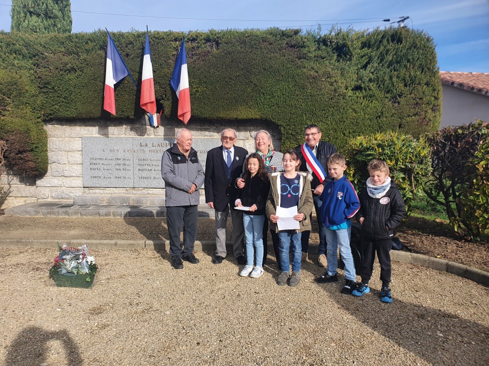 cérémonie au monument aux morts avec fleurissement par les membres du conseil municipal enfants du chemin de la mémoire.